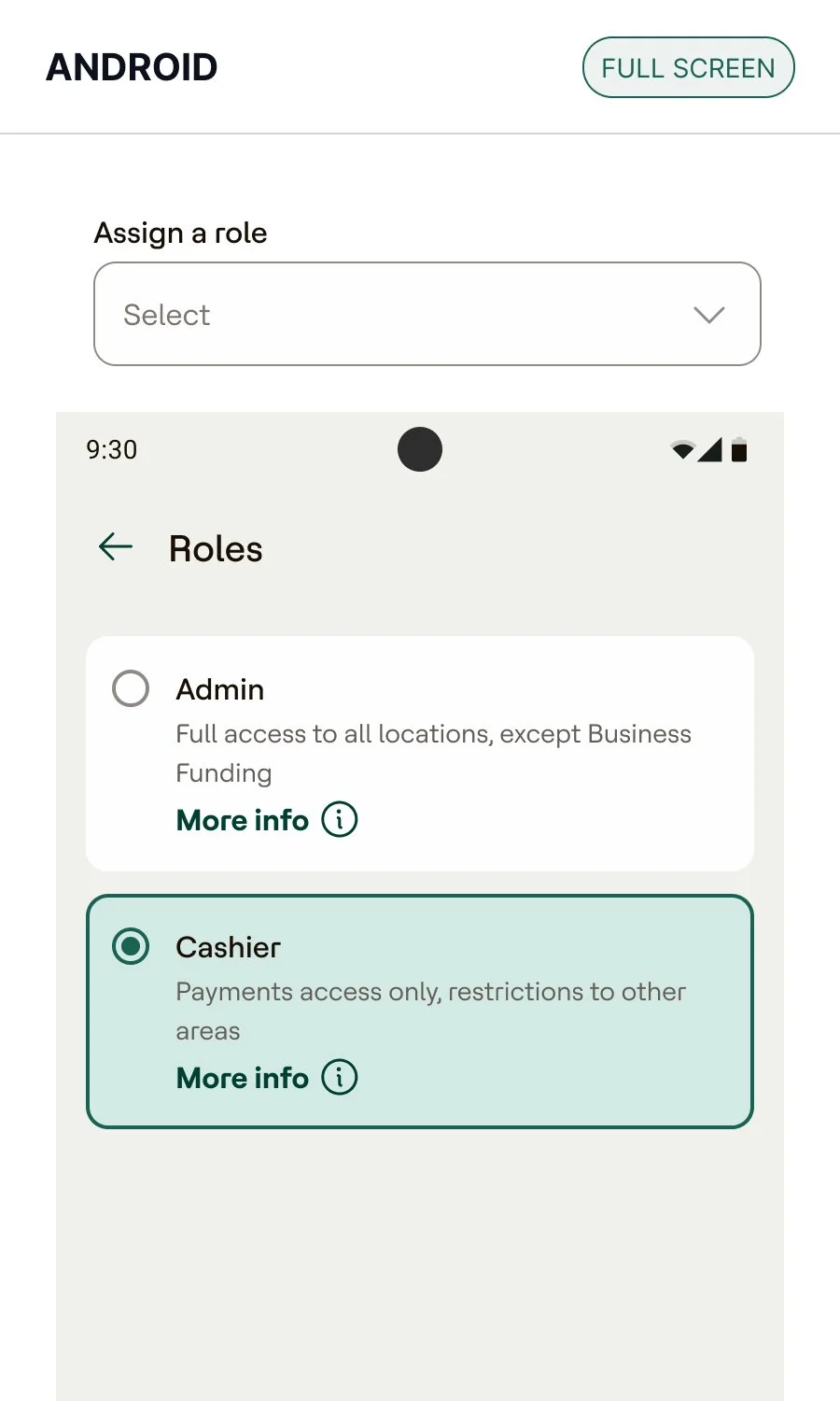 Full screen modal, with a back-button dismiss, showing a list of radio cards with a back to previous screen icon.