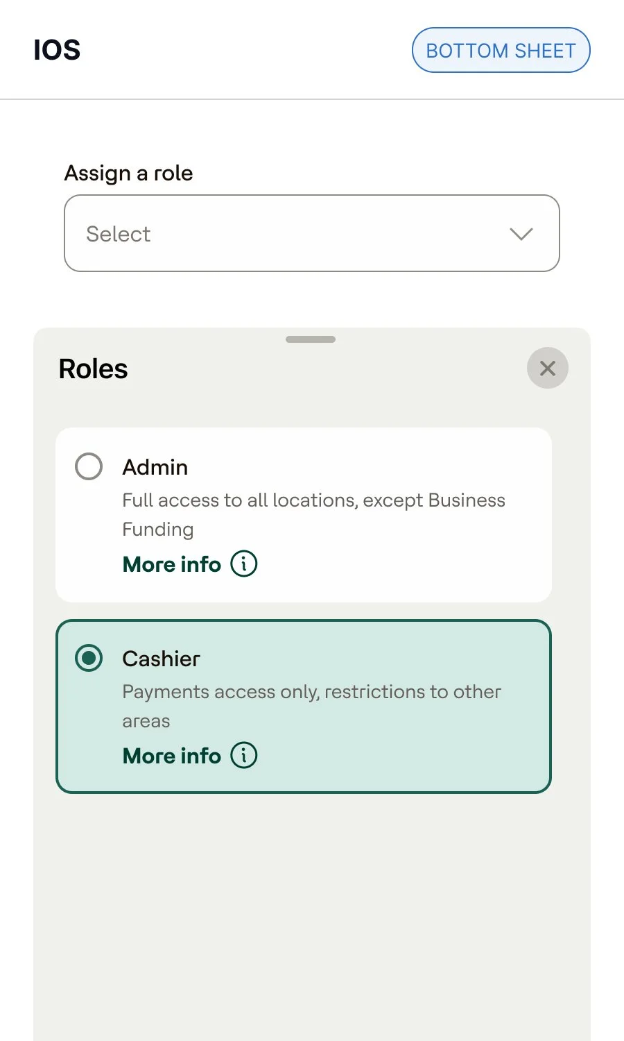 Native iOS Sheet slides up and overlays the content, showing a list of radio cards with a close dismiss icon.